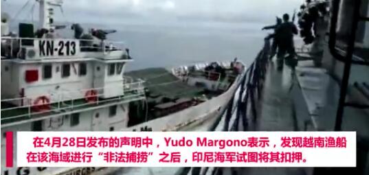 在印尼军方公布的视频中,越南渔政船在主动撞上印尼海军护卫舰后,印尼海军士兵持枪与越南渔政人员进行对峙,并使用木棍等工具击打越南渔政船,印尼海军士兵还大声叫骂越南渔政人员,并对他们竖起了中指。