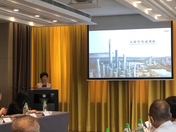 四川天府新區成都黨工委副書記劉榮華會上推介了天府中央商務區規劃建設、產業發展等投資環境情況。該商務區位於四川省成都市城市中軸線南端,距傳統城市中心25公里,是國家級新區四川天府新區的核心區域,規劃面積26.8平方公里。天府中央商務區注重生態有機共生、軌交引領開發、產城多元融合、高端要素集聚、文化品質提升,突出總部經濟、會展博覽、國際交往、生態公園四大功能定位,布局總部經濟、會展博覽、宜居活力三大功能板塊,重點發展總部經濟和會展博覽,將大美生態環境與產業空間布局有機結合,着力打造世界級中央商務區、未來成都城市新中心。