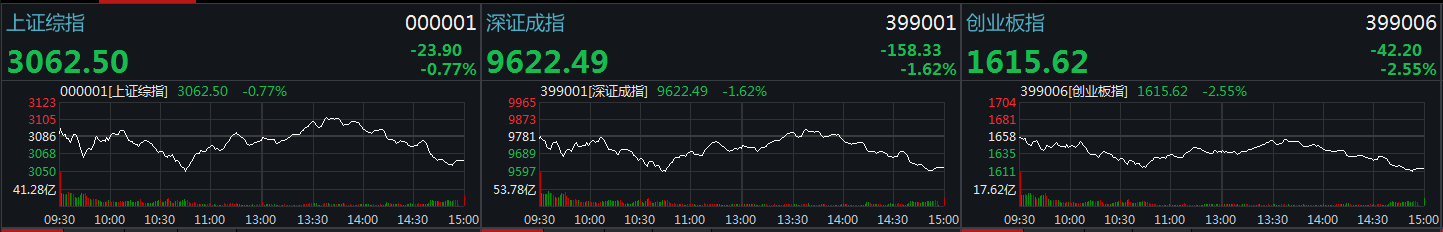 截至收盘,沪指报3062.50点,跌幅0.77%,成交额2890.63亿;深成指报9622.49点,跌幅1.62%,成交额3567.82亿;创业板指报1615.62点,跌幅2.55%;成交额1044.65亿。