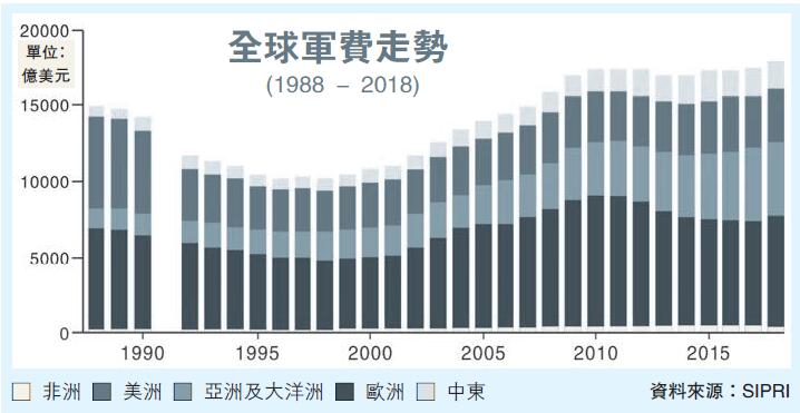 報告說,2018 年全球軍費開支總額為1.8 萬億美元,比2017 年增加2.6%,是1988 年有紀錄以來的最高值。其中,美國的軍費開支佔到全球總額的36%。美國一國的軍費開支幾乎同緊隨其後的八個國家的軍費開支總和相當。SIPRI 軍火與軍費項目負責人弗勒朗說: 「美國特朗普政府從2017 年開始執行的新武器採購項目推動了美國軍費的增長。」