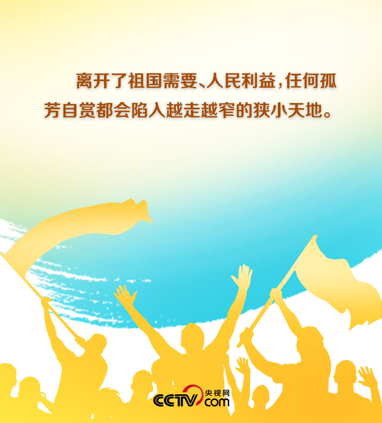 青年的人生目标会有不同,职业选择也有差异,但只有把自己的小我融入祖国的大我、人民的大我之中,与时代同步伐、与人民共命运,才能更好实现人生价值、升华人生境界。离开了祖国需要、人民利益,任何孤芳自赏都会陷入越走越窄的狭小天地。