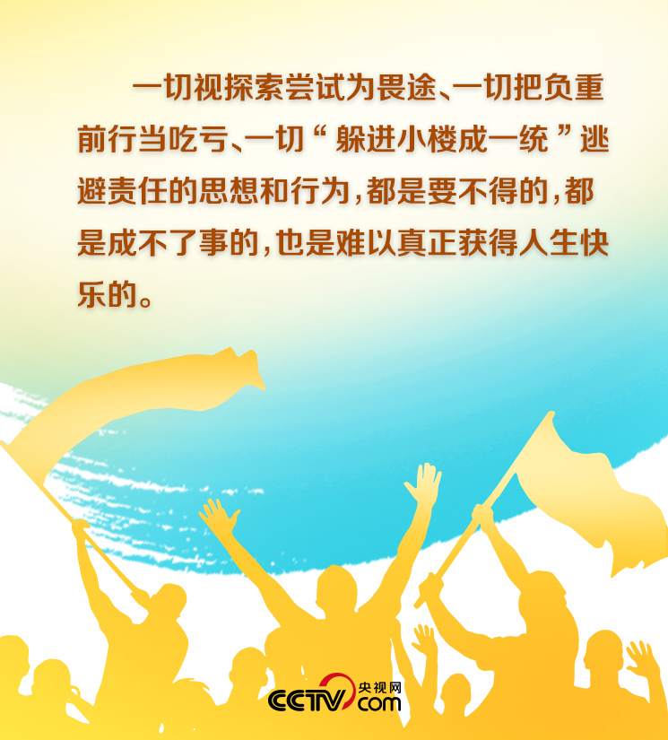 ◆一切视探索尝试为畏途、一切把负重前行当吃亏、一切“躲进小楼成一统”逃避责任的思想和行为,都是要不得的,都是成不了事的,也是难以真正获得人生快乐的。