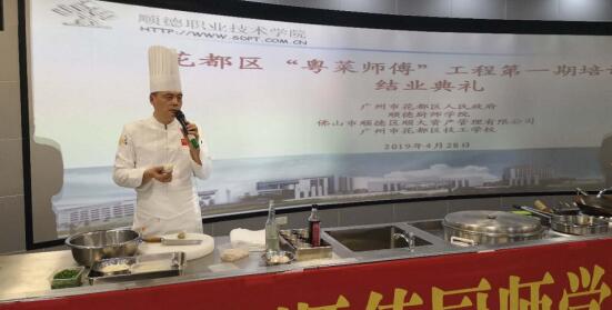 随后,顺德厨师学院领导在典礼上对花都区委区政府和相关部门对本次活动的支持表示感谢,学院将秉承高品质理念,全力以赴做好后续的培训承办和服务工作,希望双方在接下来的培训中加强沟通,增进互相了解,共同制订“广府菜”的标准,共同推进花都区“粤菜师傅”工程,把“粤菜师傅”工程工作做得更加深入、更加持久。顺德职业技术学院领导对本次培训班培训成效给予了充分肯定,希望参训学员在提升个人技能、学以致用之余能开拓视野、贡献部门、回馈社会,同时指出,顺花两地积极合作,必将充分发挥协同效应,为顺花人才共融、互联互通作出贡献。