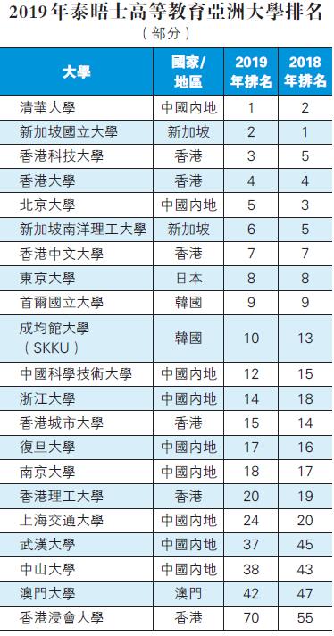 【香港商報网訊】記者馮仁樂報道:泰晤士高等教育(THE)公布2019年「泰晤士高等教育亞洲大學排名」。在今年參與排名的400多間來自27個國家或地區的高等院校中,北京清華大學取代新加坡國立大學成為亞洲第一,是首次有中國大學在此項排名中奪冠;排第3名的香港科技大學,是本港排名最高的大學。