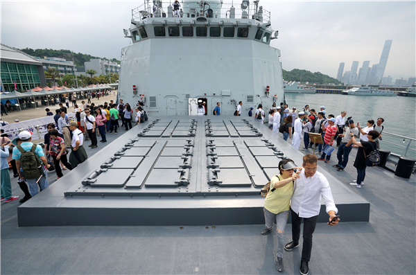 【香港商報网訊】記者馮煒強報道:被譽為「中華神盾」的導彈驅逐艦「海口號」,聯同導彈護衛艦「黃山號」靠泊香港駐軍昂船洲海軍基地,昨第2日開放讓市民參觀。昨全日共有5000名市民到臨,除登上軍艦外,還可近距離接觸解放軍各式陸上作戰槍炮武器,感受國家軍隊的「船堅炮利」。參觀市民紛紛於艦上「打卡」,並對是次能夠登艦讚不絕口,認為大開眼界。