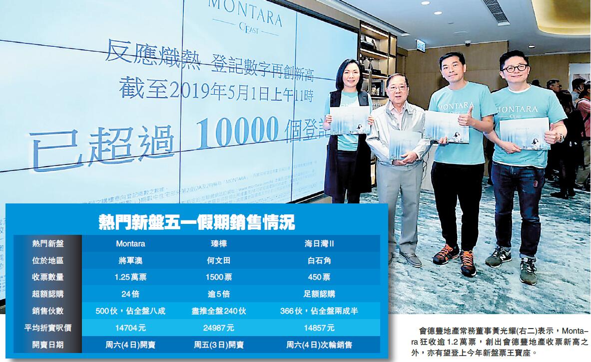 由會德豐(020)、南豐與港鐵(066)合作的日出康城7A期Montara,登場以來已推出共4張價單,涉及一共500伙,佔全盤616伙逾八成,平均折實呎價為1.47萬元。會德豐地產常務董事黃光耀昨表示,項目累收超過1.2萬元張入票,創出集團收票新高的同時,亦有望登上今年新盤票王寶座。