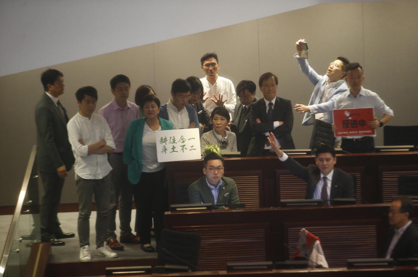 反對派議員搗亂立法會內會。圖為一眾反對派議員圍住被逐的毛孟靜(後排中座者)。