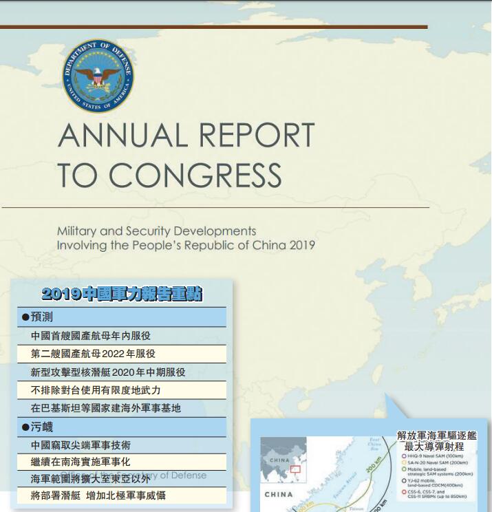 【香港商報网訊】美國國防部當地時間5月2日發佈2019中國軍力報告,著重描述了中國在南中國海的軍事化行動,並描述了北京若決定武統台灣可能采取的方案等。此外,美國國防部還預料,中國首艘國產航母將在今年內服役,中國可能在巴基斯坦等國家增加軍事基地等。