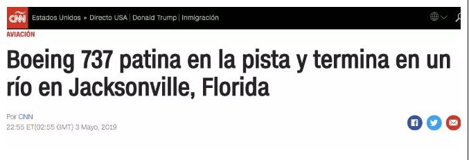 据美国新闻网站“Heavy”和美国有线电视新闻网(CNN)刚刚消息,当地时间5月3日晚间,在佛罗里达州杰克逊维尔国际机场,一架载有140人的波音737客机冲出跑道,滑入圣约翰河中。这架商业航班载有140人,包括133名乘客和7名机组人员。