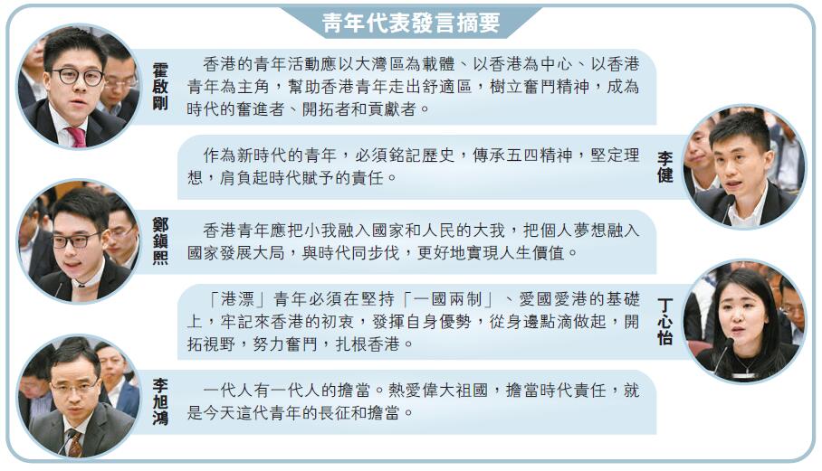 【香港商報網訊】昨日在紀念五四運動100周年暨學習習近平總書記在紀念五四運動100 周年大會上的重要講話座談會上,香港各界青少年活動委員會執行主席霍啟剛、中企協青年委員會主席李健、香港大學學生鄭鎮熙、浙江旅港青年會會長丁心怡、中聯辦行財部員工李旭鴻等5 名青年、學生代表暢談港青如何在新時代傳承五四精神,為香港和國家發展貢獻青春力量。