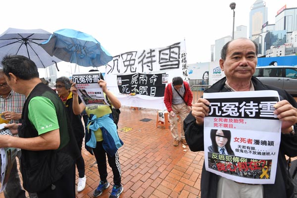政團「珍惜群組」在立法會外為在台灣遇害港人潘曉穎高懸「沉冤待雪」橫幅,指責政棍漠視人命,瘋狂拉布阻撓修改《逃犯條例》。他們要求立法會盡快完成修例,令兇徒可以移送兇案發生地台灣受審,將兇手繩之於法。