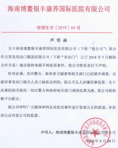 4月28日,博鳌银丰医院发布声明称,上述事件是其原合作方青岛美泊门集团有限公司(以下简称“美泊门”,医院方已于2018年7月与其解除合作)擅自接种来源不明疫苗所为,目前涉事美泊门相关人员已被依法刑拘,医院方无人涉嫌刑事犯罪。