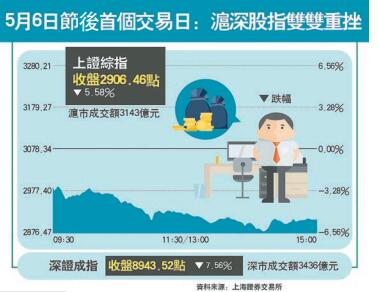 【香港商報網訊】5月首個交易日,受節前市場調整慣性及節日期間外圍利空因素的影響,A股遭遇重挫。四大股指悉數大跌,滬深兩市再現「千股跌停」。上證綜指盤中一度跌破2900點整數位,尾盤仍錄得5%以上的跌幅。深市三大股指跌幅都超過了7%。