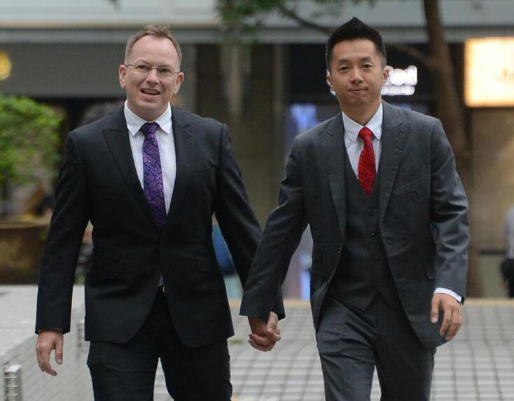 梁鎮罡昨早與其在新西蘭結婚的外籍同性伴侶手拖手到庭聽審。但無回應提問。