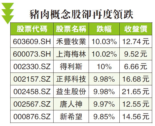 反觀豬肉概念股昨日再度領跌,截至收盤,禾豐牧業、上海梅林、得利斯、正邦科技、益生股份、唐人神跌停,新希望、天康生物、華統股份大跌逾9%。而在5月7日,豬肉概念板塊盤中跳水大跌,傲農生物收盤跌超8%,正邦科技等多股跌逾7%。