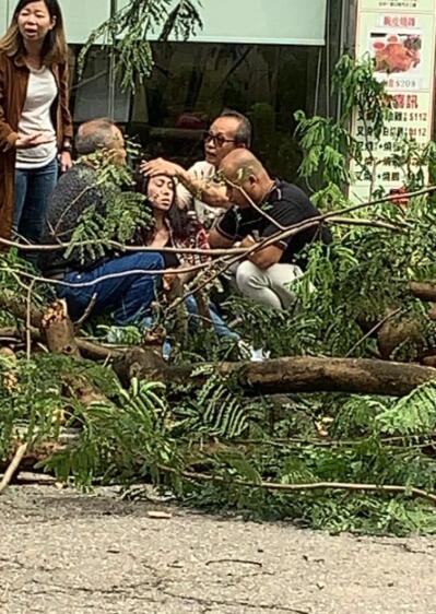 女傷者被倒塌大樹擊中倒地,多名途人協助救人。讀者提供圖片