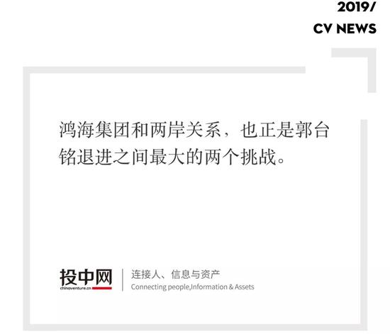 总得来说,掌握着庞大鸿海集团的郭台铭,选择从私营企业转向政坛时,退进之间所面临的最大挑战也在于鸿海集团,以及当下两岸微妙的关系。