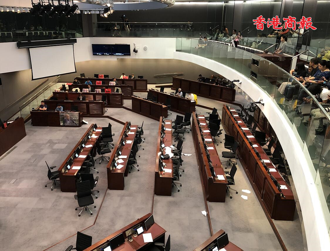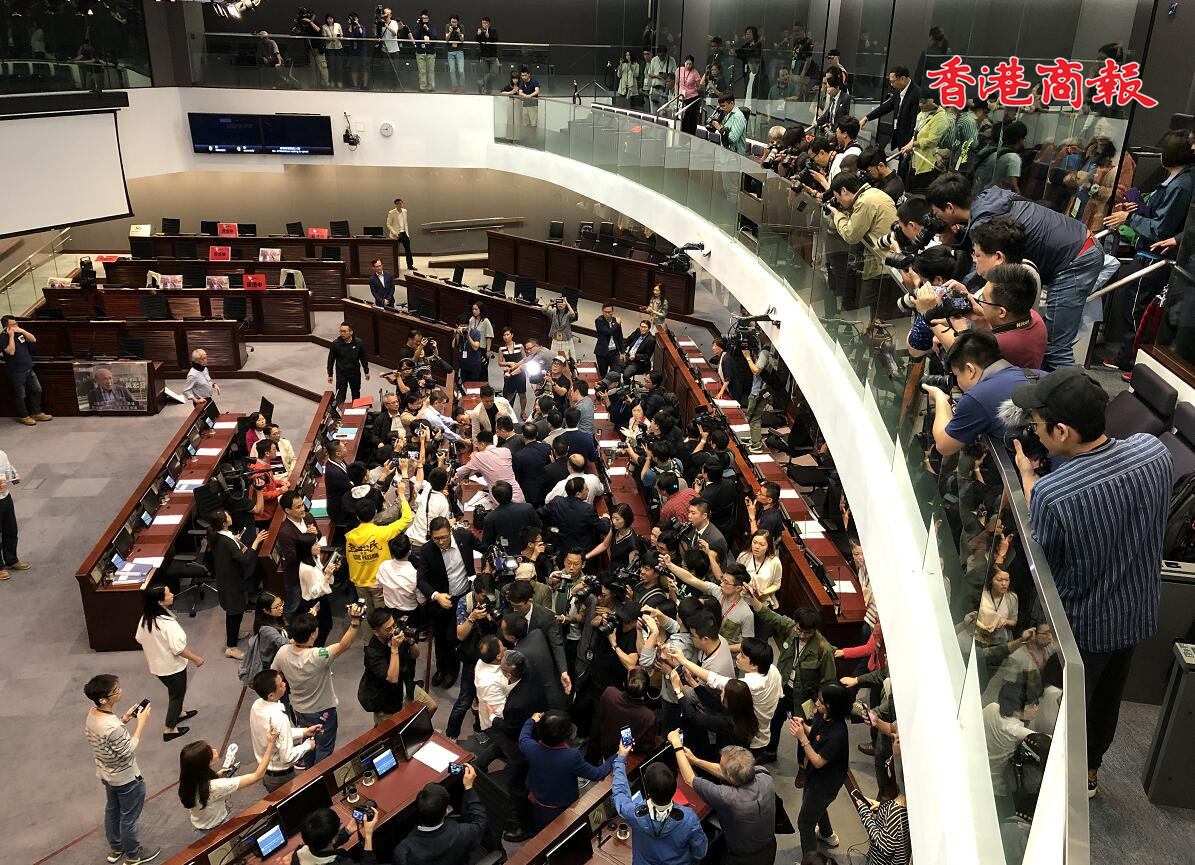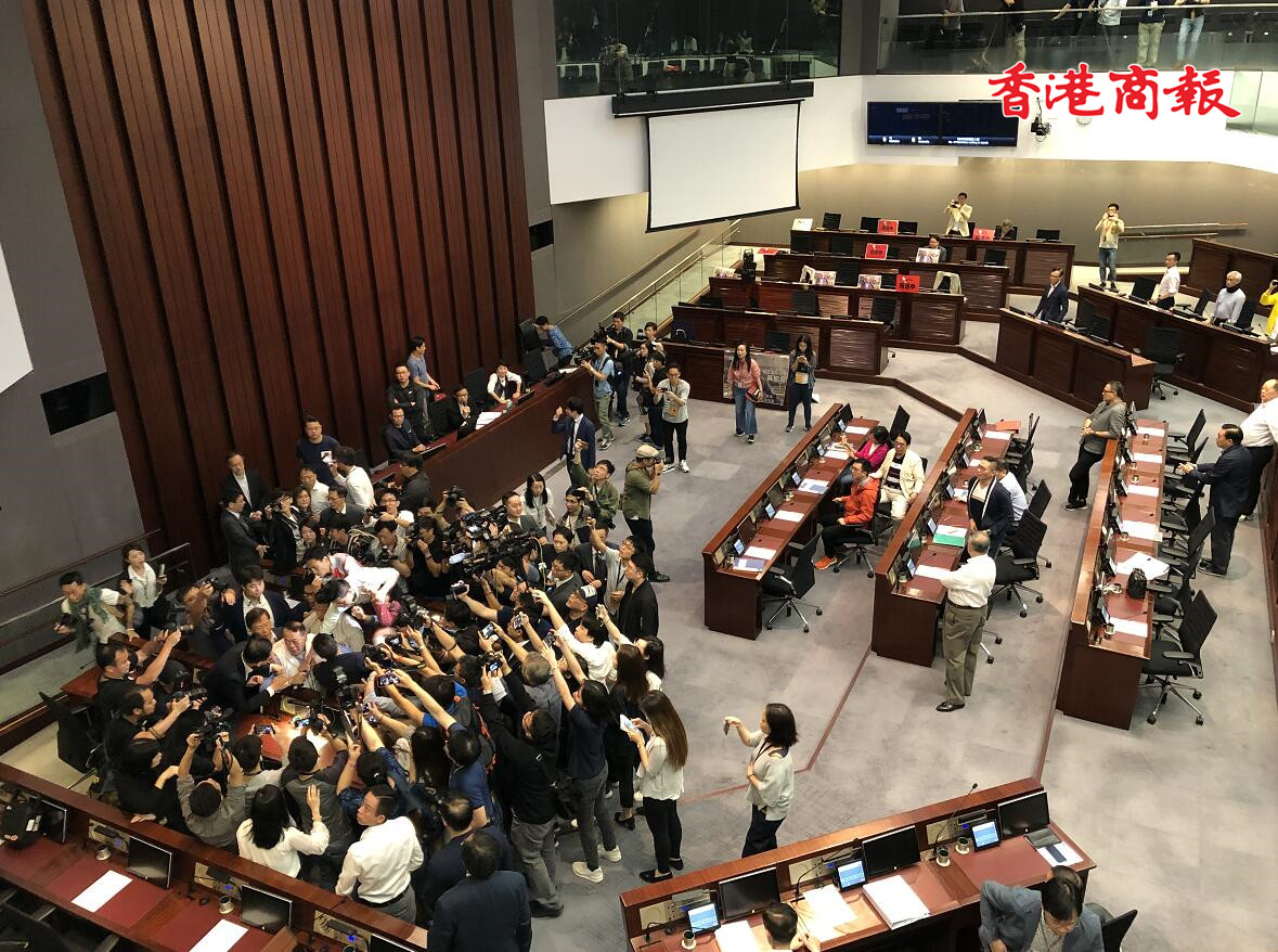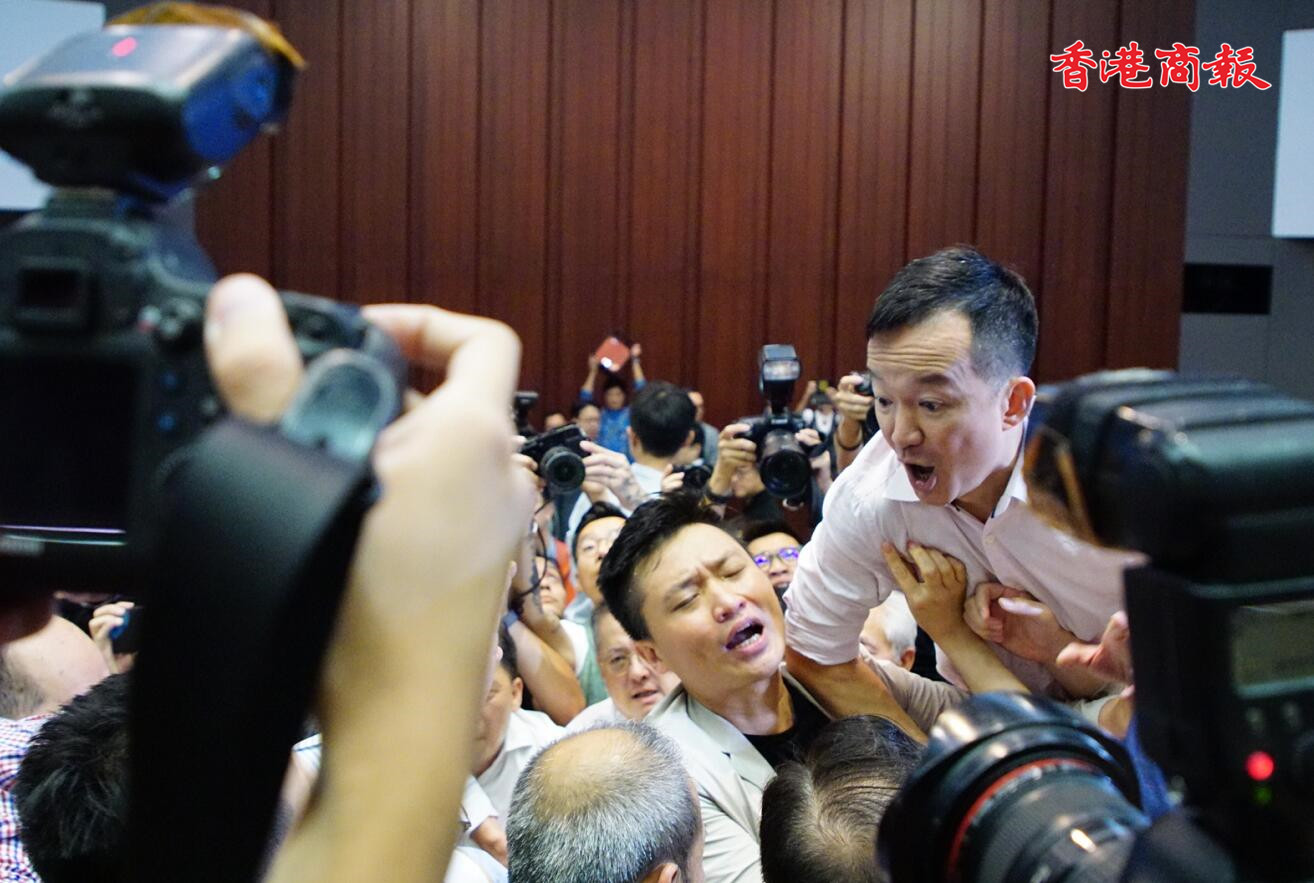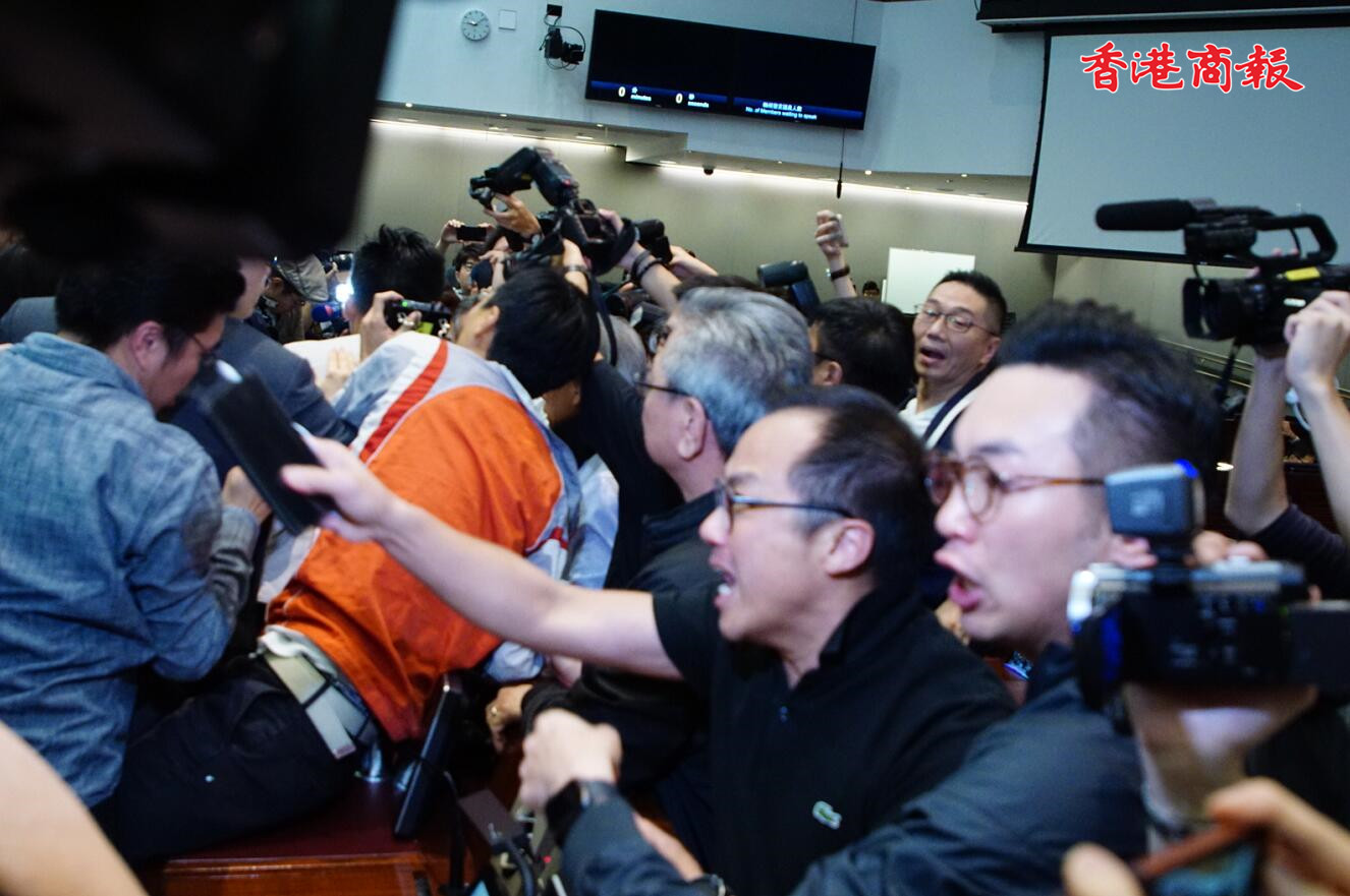 【香港商报网讯】记者刘深、梁希贤报道:立法會舉行審議逃犯修訂條例草案的委員會。非建制派議員霸佔會議室率先於8時半先行開會,到早上9時前,根據內會指引主持會議的經民聯石禮謙,在一眾建制派議員護送下進入會議廳,與非建制派發生衝突,情況混亂。