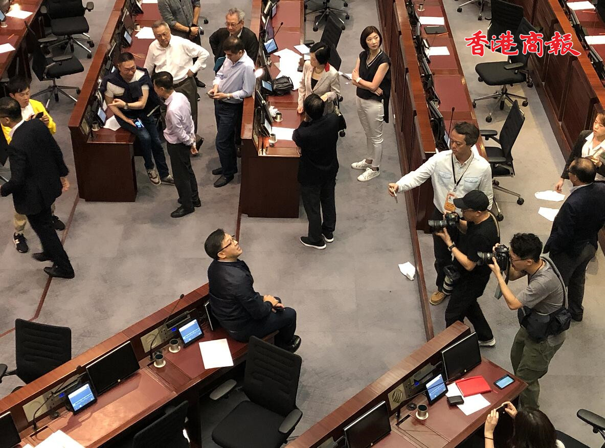 其後石禮謙在建制派議員護送下,成功進入會議室1,他嘗試到自己的坐位就坐,但受到民主派議員阻撓,議員朱凱廸和范國威一度站上檯上,兩派議員互相指罵,石禮謙未能主持會議。