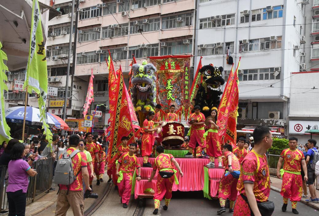 筲箕灣譚公誕有舞獅花車巡遊。記者蔡啟文攝
