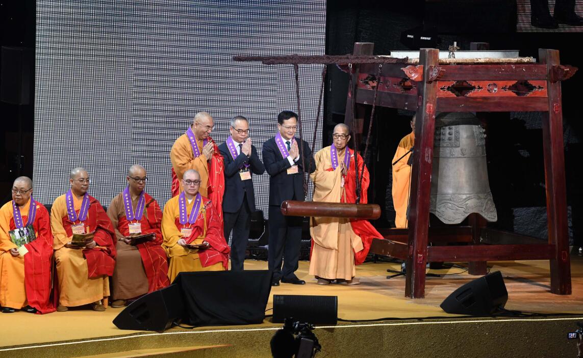 浴佛大典於昨日下午3時舉行,有近8000名市民出席。香港佛教聯合會榮譽會長智慧長老、香港佛教聯合會會長寬運法師、中聯辦副主任陳冬、民政事務局局長劉江華為大會擔任主禮嘉賓,一同鳴吉祥鐘祝願佛光普照、風調雨順、香港祥和(圖)。記者 崔俊良攝