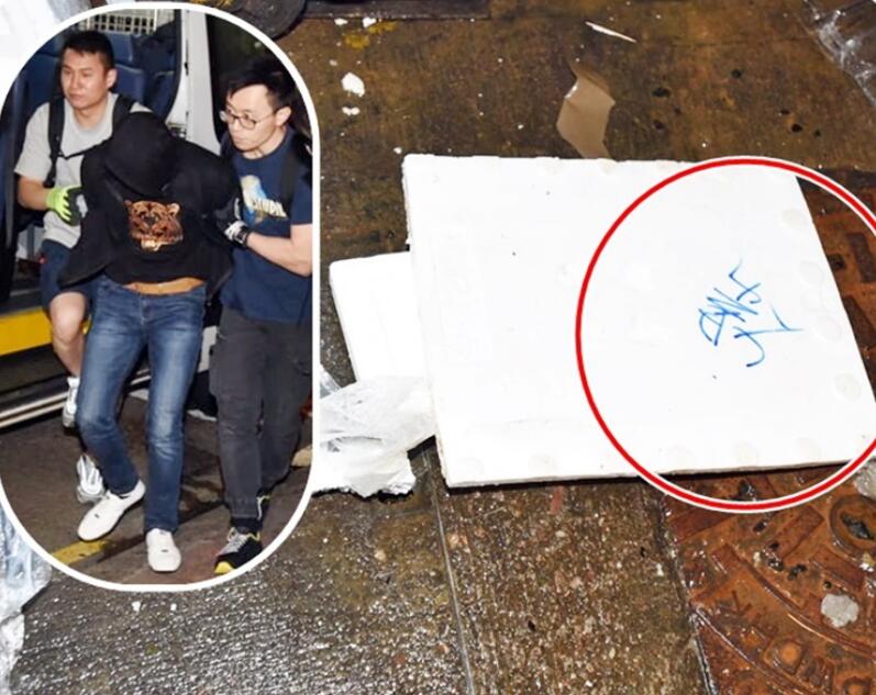 拘捕行動期間,警方還在店鋪後門外一堆發泡膠箱中,發現其中一個箱蓋上寫有「爆」字,懷疑是賊人早前留下的標記。
