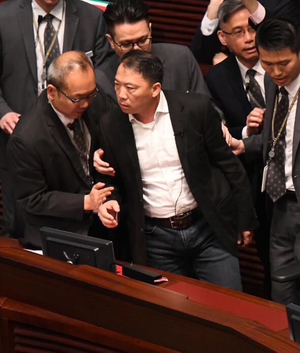 胡志偉(前中)於5月9日立法會特首答問大會出言侮辱行政長官林鄭月娥後,被主席梁君彥勒令驅逐並由保安員帶離會議廳。記者崔俊良攝