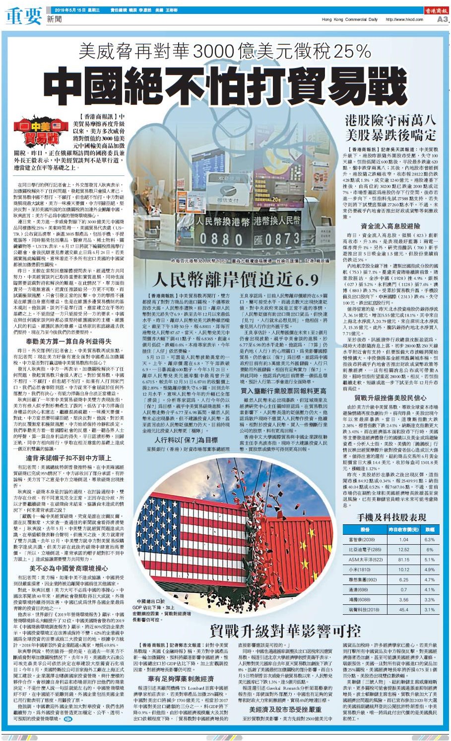 連日來,美方進一步威脅對餘下約3000億美元中國商品同樣徵稅25%。美東時間周一,美國貿易代表處(USTR)公布貨品清單,涵蓋3805類產品,包括手機、手提電腦等,同時豁免包括藥品、醫療用品、稀土物料、關鍵礦物等。USTR表示,6月17日將就下輪關稅措施舉行公聽會,會後抗辯意見書遞交截止日為6月24日。若美國實施此輪關稅,意味差不多所有出口美國的中國貨都被加徵懲罰性關稅。