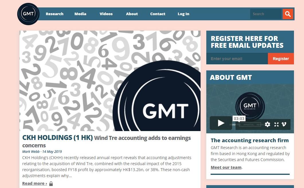 GMT昨指控長和在編製2018年度全年業績時,刻意隱藏577億元債務,同時誇大全年純利38%或 132億元。GMT Research網頁截圖