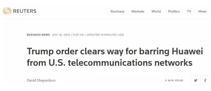 路透社15日就预告特朗普会针对华为签署这样的行政命令。特朗普真的签署后,路透社再次强调,这就是在为禁止美国企业与华为有生意往来铺平道路。