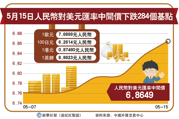 隨着中美貿易談判緩和,人民幣兌換美元匯率中間價從去年11月的最低值跌破6.96關起步,反覆升值,到3月份見到最高點突破6.70,到達6.68一線。但是,中美貿易戰最終再次升級,讓人民幣匯率反覆承壓。5月15日人民幣兌換美元匯率中間價跌破了今年的起步價6.8632,到了6.8649,不但將今年以來所有升值幅度吞噬,更出現17個基點或0.024%的微弱貶值幅度。