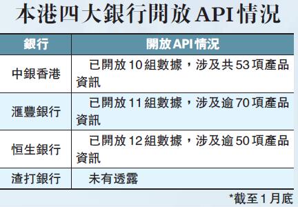 在今年1月底前,包括滙豐(005)、恒生銀行(011)、渣打(2888)及中銀香港(2388)在內的多家港銀,已陸續開放旗下API。其中,豐指出,該行共開放11組數據,涉及70項產品資訊;恒生表示開放了12組資料共50多項產品資訊;中銀香港稱開放了10組數據,涉及53項產品資訊;渣打則未有透露開放了多少組。