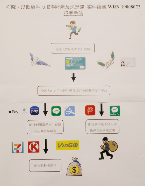 西區警區重案組和情報組人員接手跟進及深入調查後,發現有數名南亞裔人士在凌晨時分活躍於尖沙咀一帶進行扒竊,專找一些飲醉酒人士作目標,盜取其身份證明文件、手機和信用卡,再將信用卡資料,以短信形式發送給同黨,當他們收到資料後,將信用卡的資料綁定在手機電子支付軟件,在港島西九龍一帶便利店購買點數卡,最後將點數卡折讓圖利。