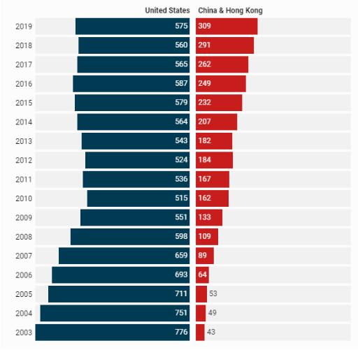 《福布斯》指出,当前的这一局面与2003年《福布斯》首次发布全球企业2000强榜单时的情况大相径庭,彼时,美国上榜企业776家,中国内地及中国香港仅有43家。