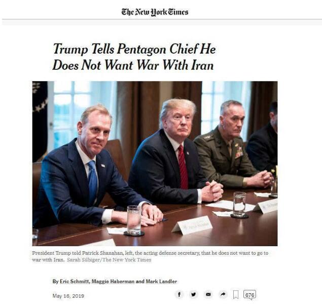 【环球网报道记者朱梦颖】美国《纽约时报》16日曝光美伊局势关键内幕:美国总统特朗普曾向他的代理防长沙纳汉表示,他不想与伊朗开战。据几位政府官员透露,他向其助手表示,美国对德黑兰政府的激烈施压不得升级为公开冲突。