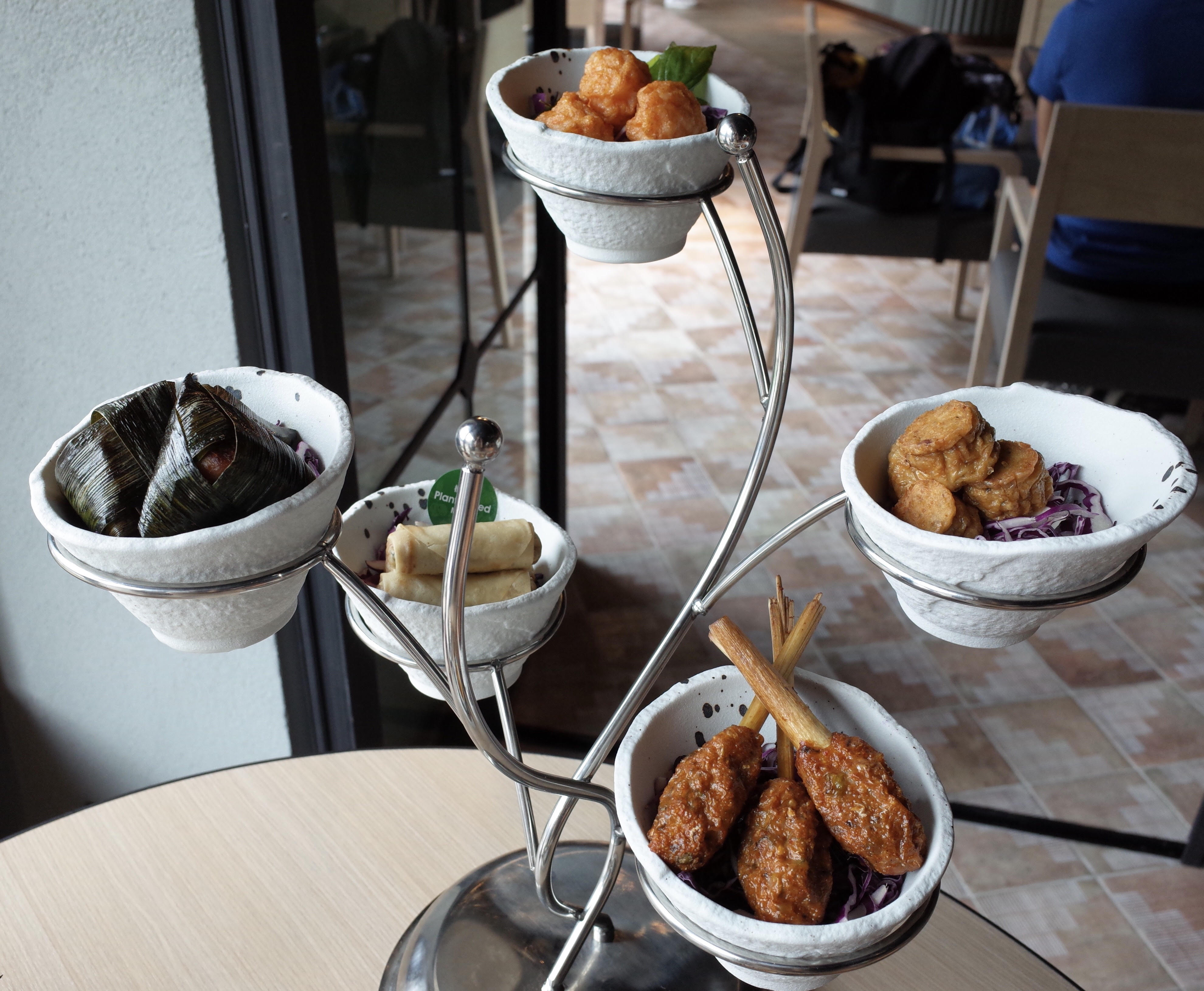 泰式小食拼盤中有泰式春卷、蝦餅、香茅魚餅、泰式雞寶及班蘭葉包雞,配搭不同醬汁,組合出不同滋味。
