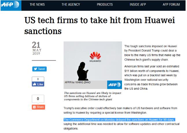 法新社说,在此背景下,美国商务部发布了“在90天内不会强制执行禁令”的消息,但其最新一份文件称,推迟实施并不意味着特朗普基于国家安全发布的禁令被取消,而是为了让华为及其合作伙伴“有时间”来维护支持当前全面运营的网络和设备,包括软件更新和补丁,以遵守2019年5月16日或者在这之前签订的具有法律约束力的合同和协议。”