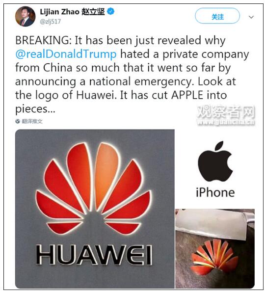他开玩笑说:“突发新闻:特朗普这么痛恨一家中国民营企业的原因揭晓了。看看华为的标识。它把苹果切成了碎片……”