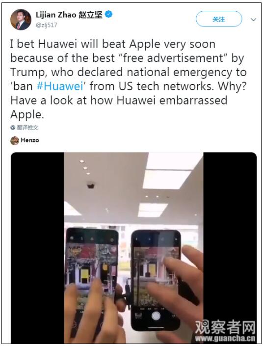 当天稍早时,赵立坚还转发一段视频称,“我打赌华为很快就会打败苹果,因为特朗普为它打了最好的‘免费广告’,他宣布全国进入紧急状态,‘禁止华为’参与美国科技网络。为什么?看看华为是如何让苹果难堪的吧。”