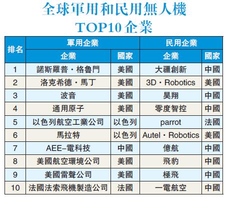 中國以大疆創新為代表的企業是全球消費級無人機的領頭羊,據統計,大疆創新佔據著全球消費級無人機市場七成以上的份額,在全球民用無人機企業中排名第一。