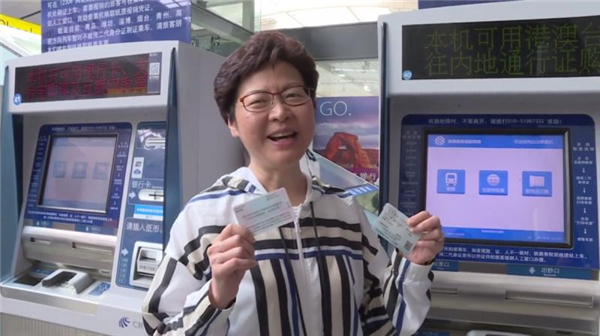 行政長官林鄭月娥於北京嘗試用回鄉卡在自動售票機購買高鐵票。