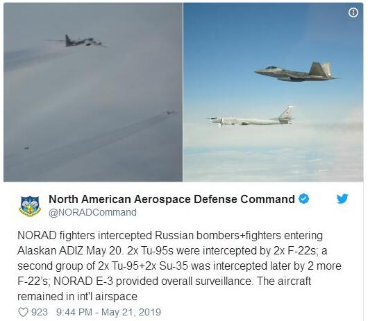 根据有线电视新闻网(CNN)等美媒报道,北美防空司令部21日发布声明说,此前一天(20日),包括4架图-95轰炸机和两架苏-35战机在内的两拨俄军机进入美国阿拉斯加州防空识别区,美军随后派出4架F-22战机进行拦截。