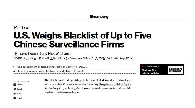 美国彭博社22日消息称,美国政府正考虑将5家中国监控设备企业列入与华为类似的“黑名单”,禁止他们获得美国零件与软件,其中包括海康威视与浙江大华。