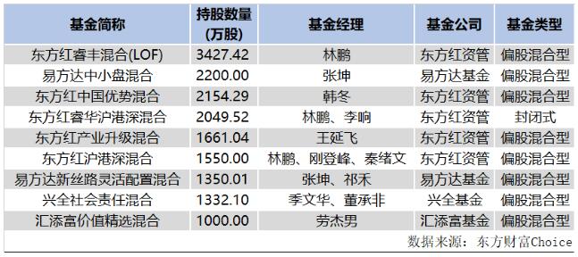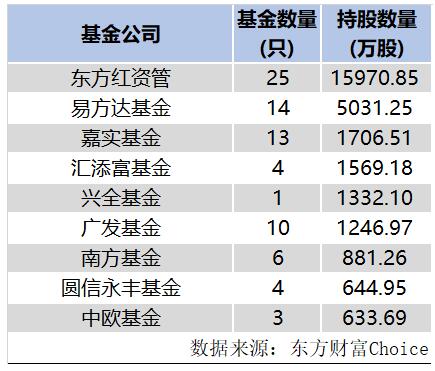 其中东方红资管持股最多,旗下25只基金持有约1.6亿股;易方达基金旗下14只基金持股5031.25万股;此外嘉实基金、汇添富基金、兴全基金、广发基金旗下基金主动持股也均超过1000万股。