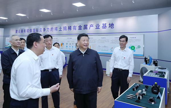 20日,習近平在江西省委書記劉奇、省長易煉紅陪同下,深入贛州市的企業、農村、革命紀念館,就經濟社會發展進行考察調研,實地了解革命老區脫貧攻堅和推動中部地區崛起工作進展情況。20日中午,習近平乘機抵達贛州,首先考察江西金力永磁科技股份有限公司。在企業展廳,習近平認真聽取企業生產經營和贛州稀土產業發展情況介紹,詳細了解我國稀土資源的分布狀況、開發技術、應用情況以及生產加工中採取的環境保護舉措。在生產車間,習近平仔細察看包裝自動檢測線、高性能燒結爐等設備生產運行情況,同現場工人親切交流。習近平對企業加大科研投入、致力科技創新、注重生態修復的做法給予肯定。他強調,技術創新是企業的命根子。擁有自主知識產權和核心技術,才能生產具有核心競爭力的產品,才能在激烈的競爭中立於不敗之地。要緊緊扭住技術創新這個戰略基點,掌握更多關鍵核心技術,搶佔行業發展制高點。稀土是重要的戰略資源,也是不可再生資源。要加大科技創新工作力度,不斷提高開發利用的技術水平,延伸產業鏈,提高附加值,加強項目環境保護,實現綠色發展、可持續發展。