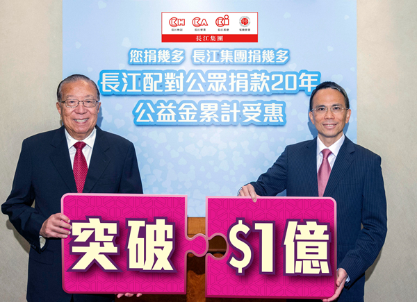 李澤鉅(右)與李業廣宣傳「長江集團配對公眾捐款20年,公益金累計受惠突破一億」。