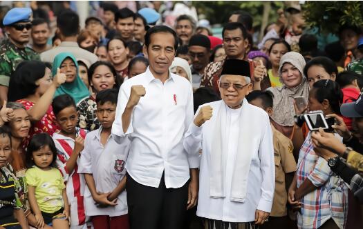5月21日,佐科(左)在竞选搭档的陪同下,在雅加达贫民区举行的集会上发表讲话。图自IC photo