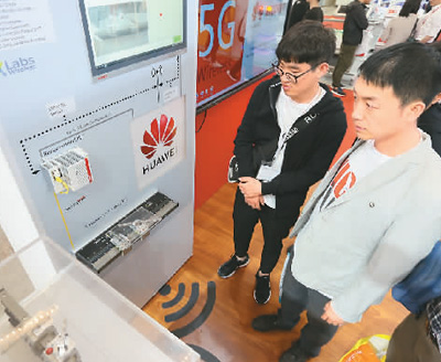 在北京2019中国国际工业智能及动力传动与自动化展览会上,观众体验华为5G通信技术。春 光摄(人民视觉) 在北京2019中国国际工业智能及动力传动与自动化展览会上,观众体验华为5G通信技术。春光摄(人民视觉)