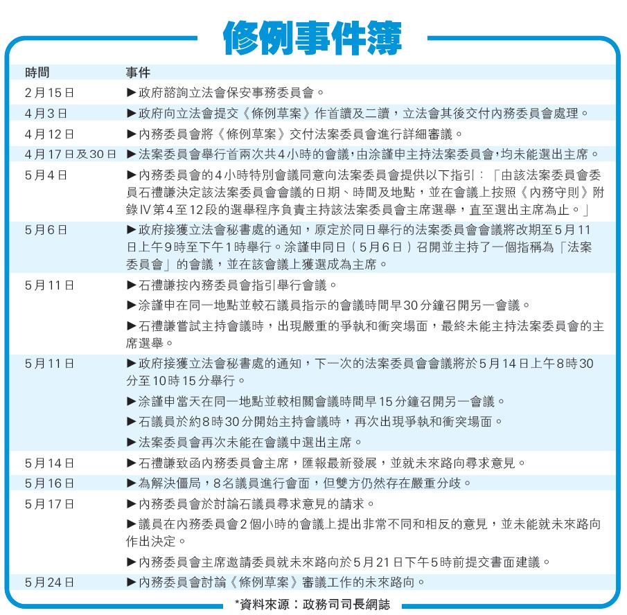 就自立法會內務委員在4月12日決定成立法案委員會以來,至今已經幾個星期仍未能選出主席,張建宗認為這是令人費解及前所未見的。政府一直積極配合法案委員會運作,每次會議都有官員準備出席會議,期望在委員會上與議員交流互動,但委員會的過去會議中出現史無前例的混亂情況,甚至出現嚴重的爭執和衝突場面,並有議員因此受傷。