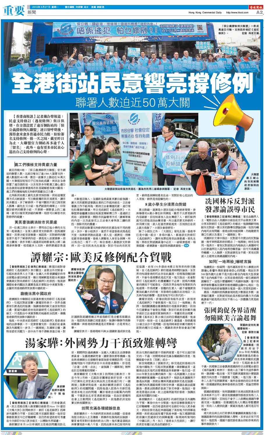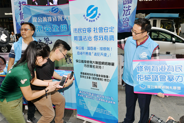 【香港商報网訊】記者戴合聲、馮仁樂、何加祺報道:民意支持修訂《逃犯條例》與日俱增,在全港設置了逾百個街站的「保公義撐修例大聯盟」連日發呼聲後,獲得愈來愈多普通市民力挺,紛紛簽名支持修例。僅一天之隔,截至昨日為止,大聯盟官方網站再多逾千人「留名」。此外,也有更多市民衷心道出自己支持修例的心聲。